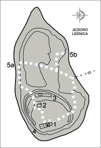 1 - pałac z kaplicą-baptysterium 2 - kościół grodowy 3 - wał obronny 4 - umocnienia brzegowe 5a - przyczółek mostu zachodniego 5b - przyczółek mostu wschodniego |