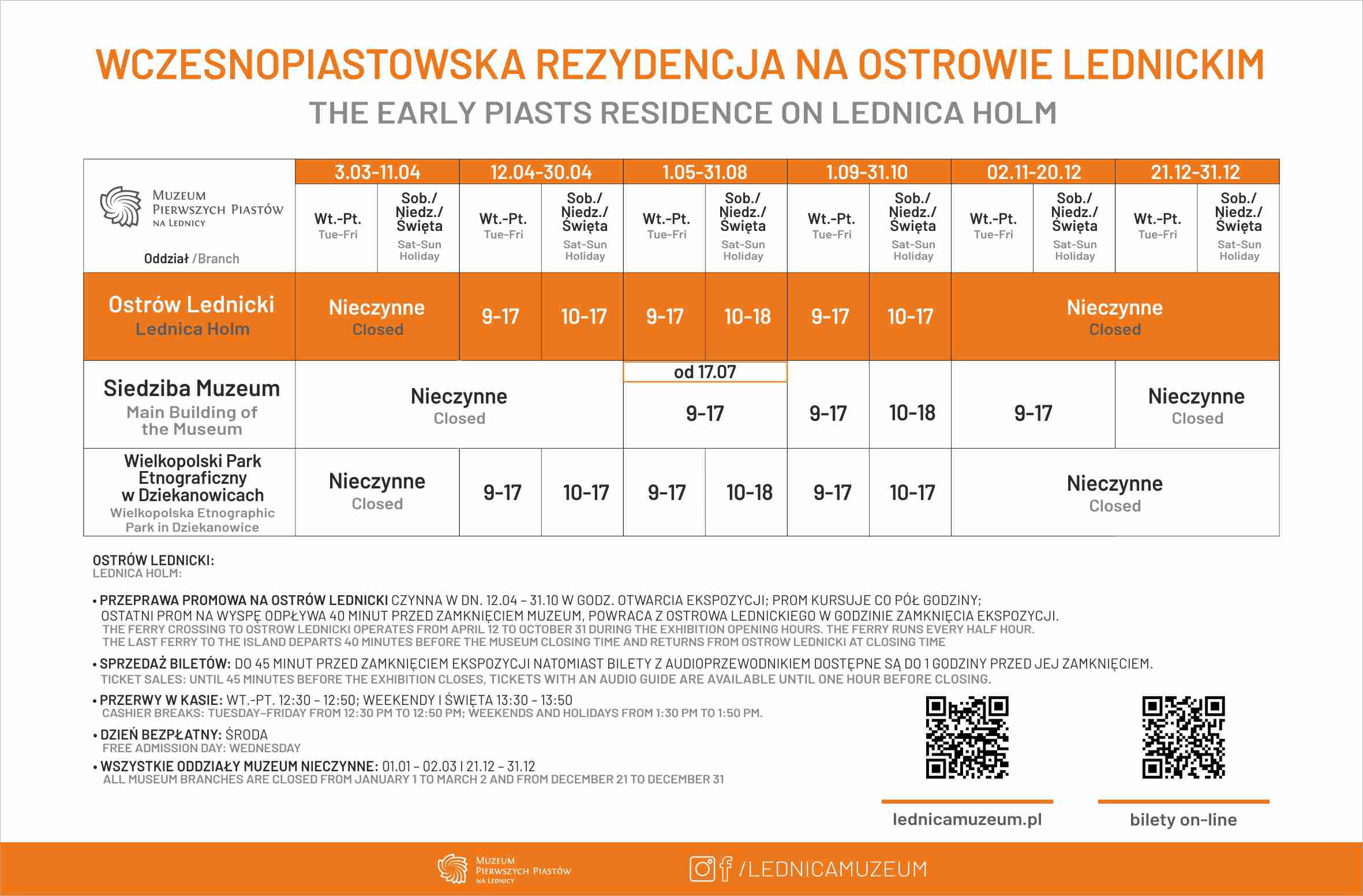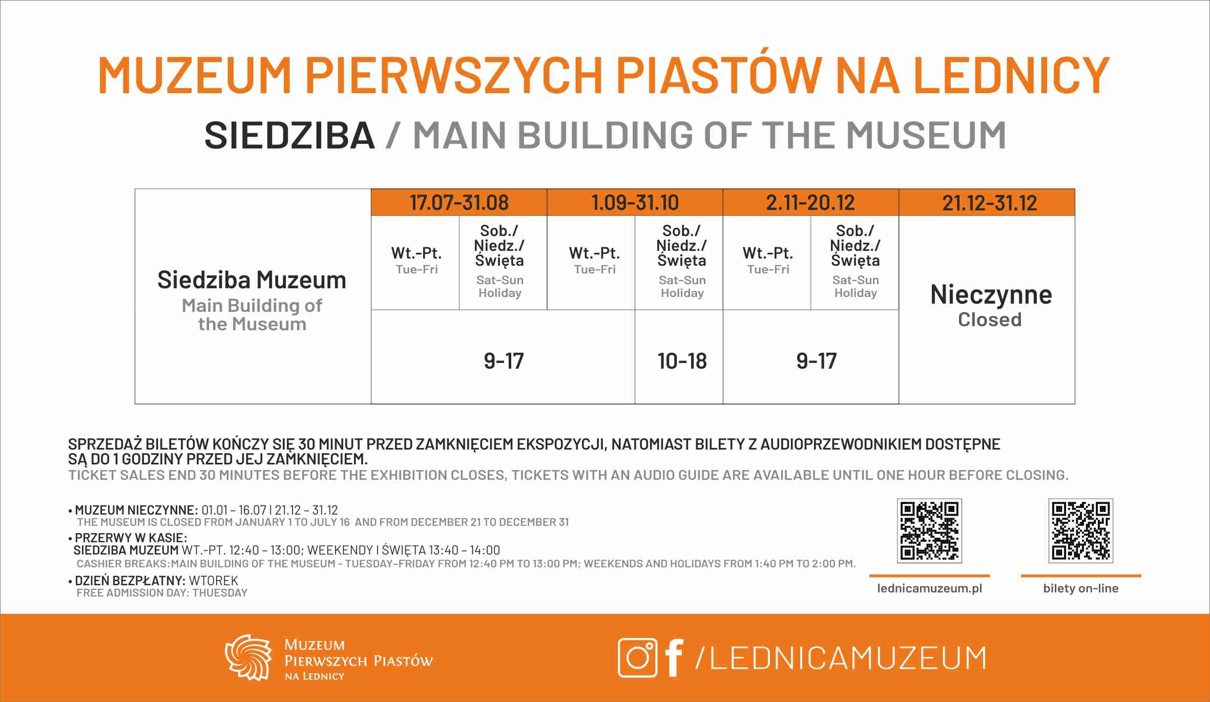 oprowadzanie w j. pol.: 200 PLN, oprowadzanie w języku obcym: 250 PLN Oprowadzenie na podstawie wcześniejszego zgłoszenia w godz. otwarcia Muzeum; zgłoszenie e-mail: edukacja@lednica.pl, informacja telefoniczna: 61 102 82 91. Jednorazowa opłata za oprowadzenie dotyczy grupy obejmującej maksymalnie 25 osób. W przypadku większej liczebności grupy (maksymalnie do 25 osób) każda kolejna osoba płaci odpowiednio za oprowadzanie po Ostrowie Lednickim: w języku polskim - 6 zł (w języku obcym - 10 zł). W przypadku grupy większej niż 35 osób wymagana jest rezerwacja i opłacenie kolejnego przewodnika. Uwaga! Muzeum zastrzega sobie prawo zmiany terminu oprowadzania lub formy zajęć z powodu niesprzyjających warunków pogodowych lub zdarzeń losowych. |
