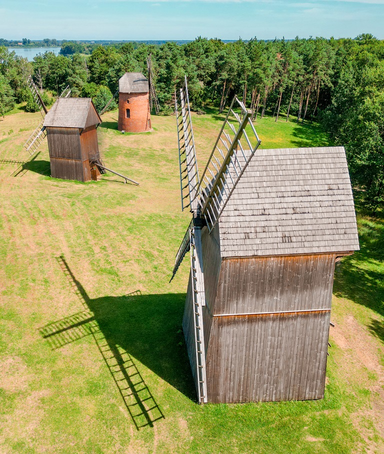 Wiatrak z Trzuskołonia (Śr. Wielkopolska) - młyn typu „holender” czterokondygnacyjny murowany z cegły, z drewnianą ruchomą czapą złożoną na biskupstwa poznańskiego. Obejście to (przeniesione do muzeum w 1980 roku) w latach 1984-1998 było zasiedlone przez rodzinę pracującą na roli i tym samym było jedyną tego rodzaju żywą ekspozycją w skali polskiego muzealnictwa na wolnym powietrzu. Obecnie w domu odtworzono jego wyposażenie z lat 60. i 70. XX wieku. Na jego tle ukazano działalność folklorystyczną mieszkańców Biskupizny a szczególnie córki i wnuczki ostatnich właścicieli zagrody.
