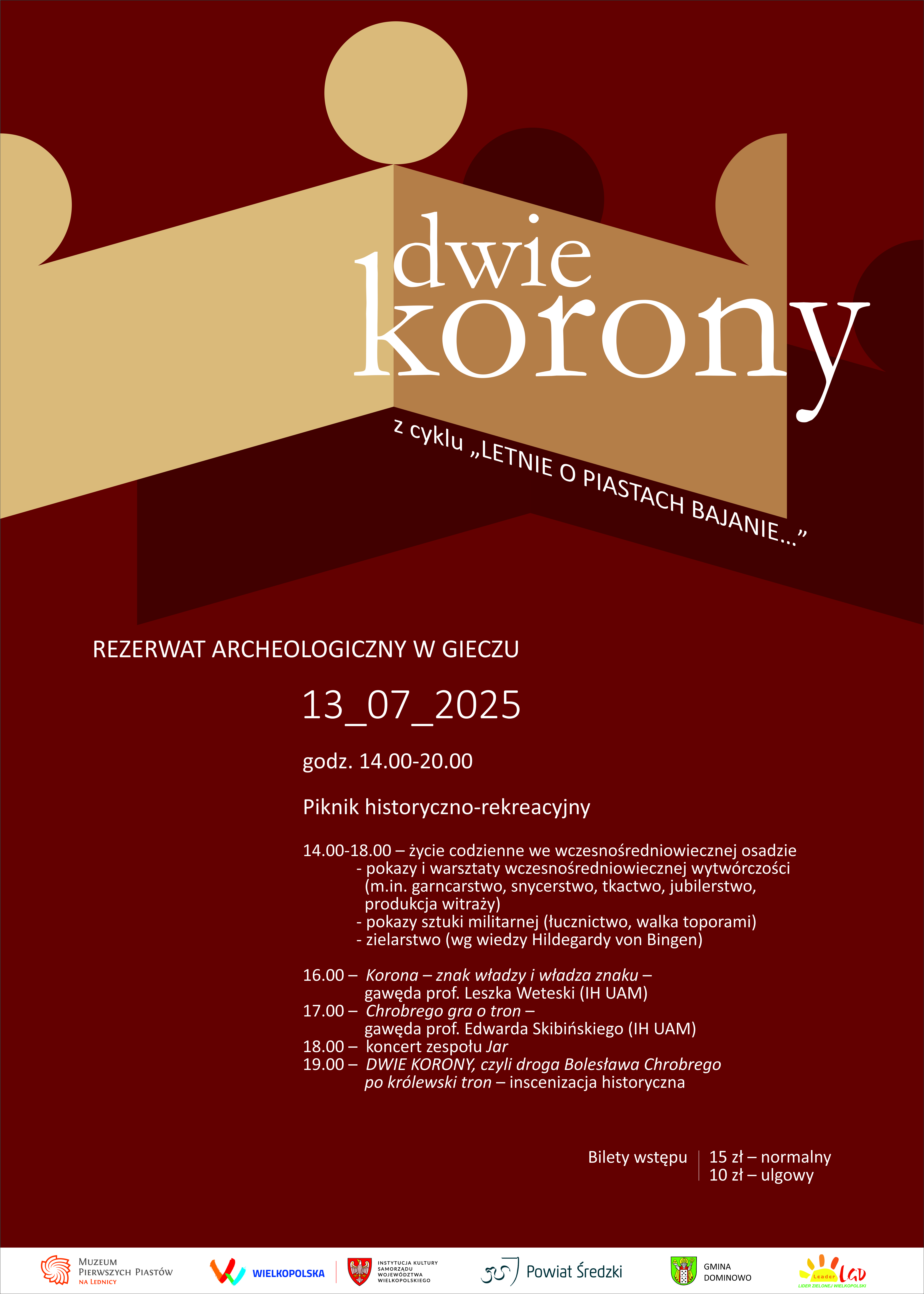 Rezerwat Archeologiczny w Gieczu zaprasza 13 lipca 2025 r. (w godz. 14.00 – 20.00) na piknik historyczno – rekreacyjny z cyklu "Letnie o Piastach bajanie… DWIE KORONY". Tegoroczny temat przewodni to oczywiście koronacja Bolesława Chrobrego.