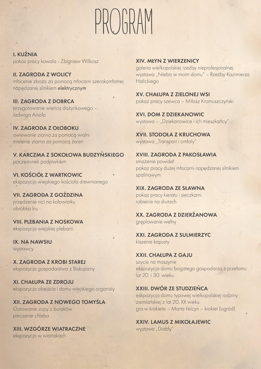 W programie znajdą się m.in.: pokazy młócenia zboża przy użyciu młocarni, owiewania ziarna wialnią, żęcia sieczki, obróbki lnu, przędzenia nici na kołowrotku, smażenia powideł, wypieku chleba, przygotowania wieńca dożynkowego, a także prezentacje umiejętności wiejskich rzemieślników i występy zespołów folklorystycznych.