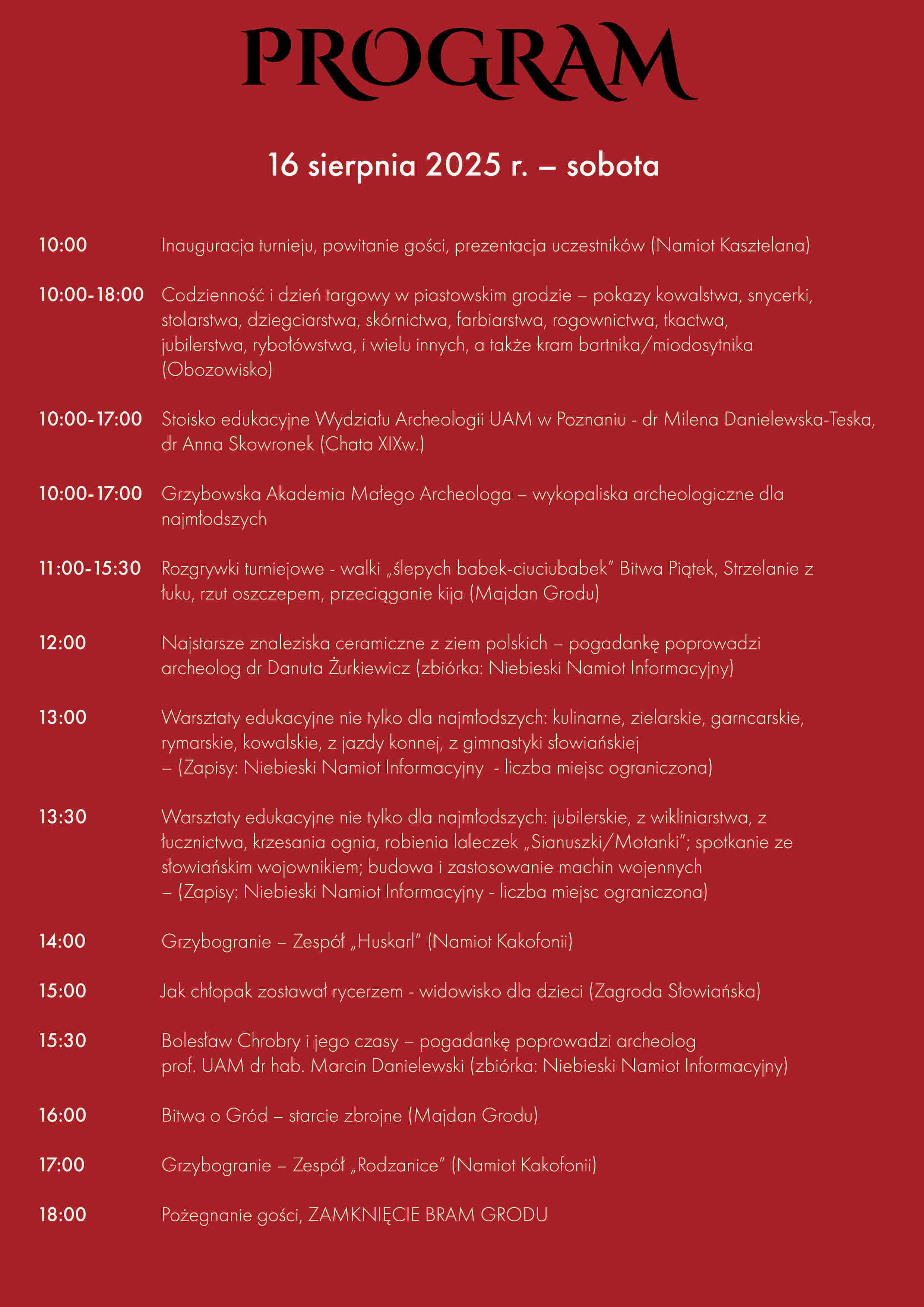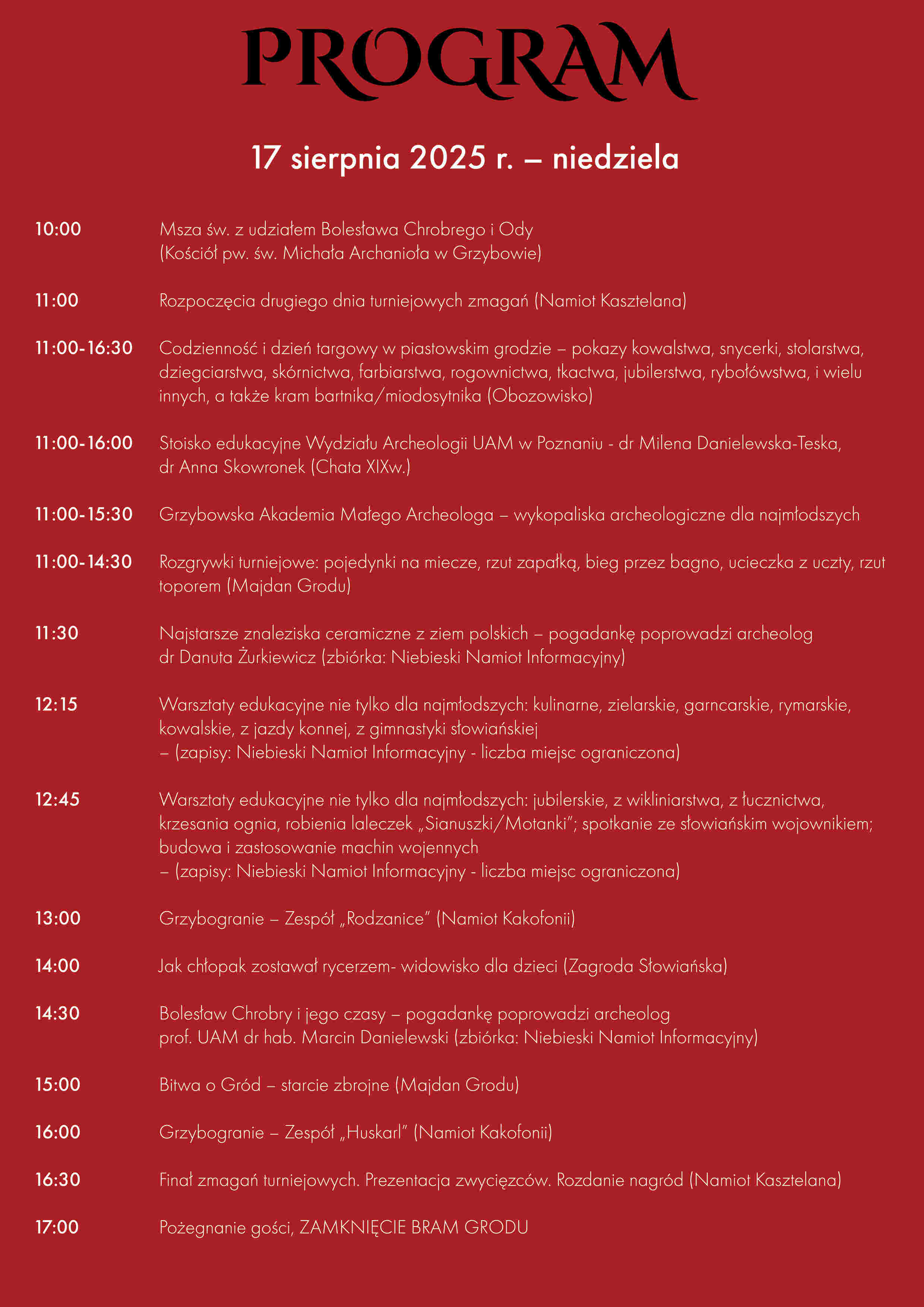 Zapraszamy na XII Grzybowski Turniej Wojów w Rezerwacie Archeologicznym Gród w Grzybowie, oddziale Muzeum Pierwszych Piastów na Lednicy. Przygotowaliśmy bogaty i pełen atrakcji program, który przeniesie Was w czasy wczesnego średniowiecza i dostarczy niezapomnianych wrażeń dla całej rodziny.