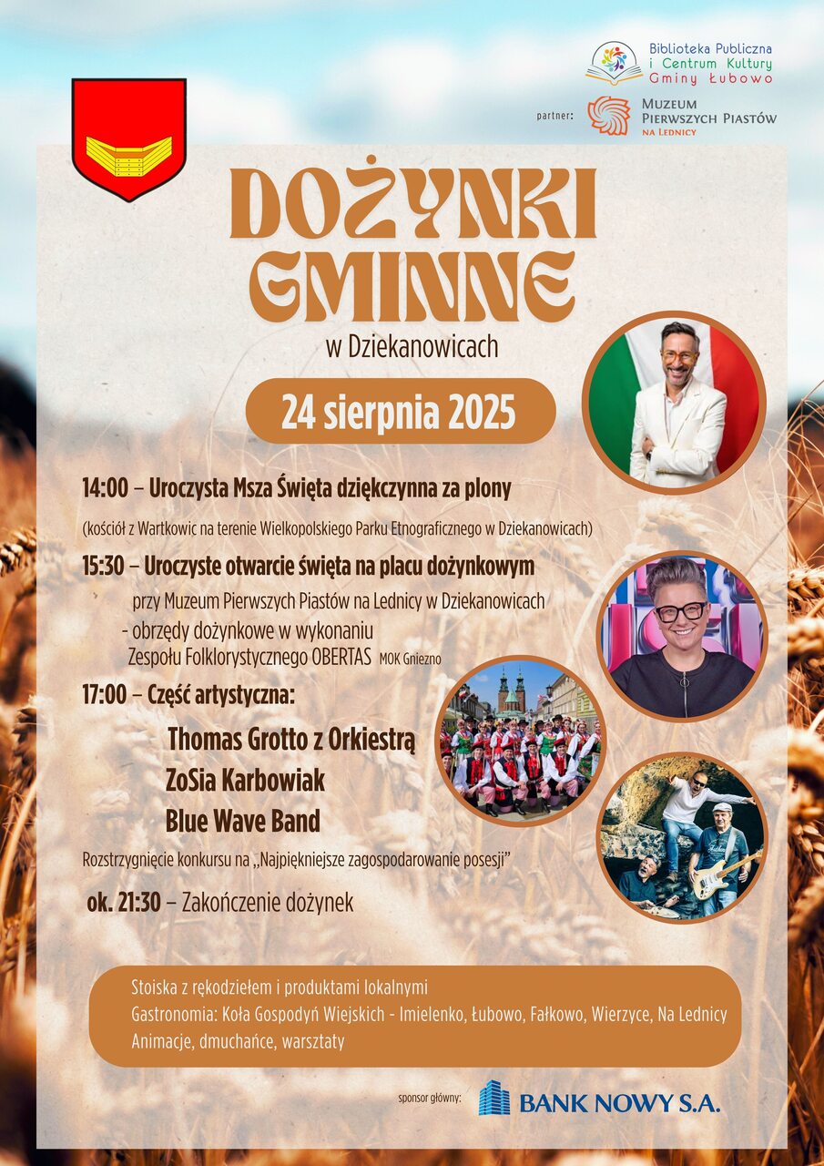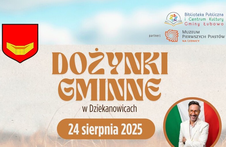 Wójt Gminy Łubowo oraz Przewodnicząca Rady Gminy Łubowo zapraszają na Dożynki Gminne, które odbędą się w niedzielę, 24 sierpnia 2025 roku w Dziekanowicach. Partnerem Dożynek jest Muzeum Pierwszych Piastów na Lednicy.