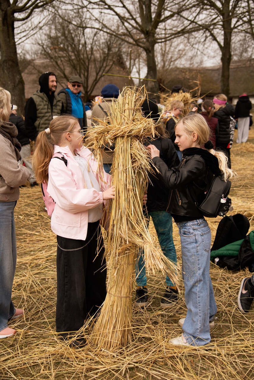 Tradycyjnie spotkaliśmy się na nawsiu, gdzie na uczestników czekały materiały do tworzenia marzann. Wsparciem służyli wolontariusze z okolicznych szkół oraz pracownicy Muzeum Pierwszych Piastów na Lednicy, którzy przygotowali jedną, dużą marzannę symbol kukły z podleszczyńskiego Zaborówca.