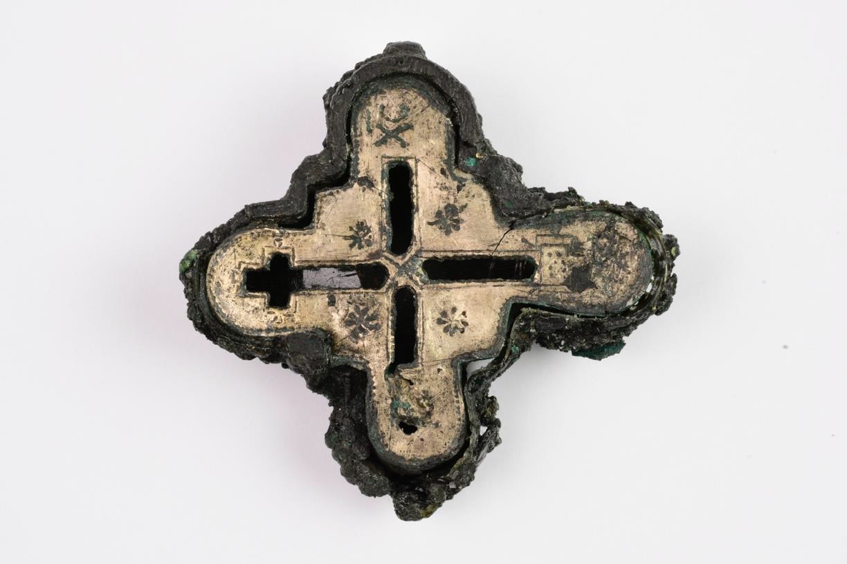 Równolegle przeprowadzono prace konserwatorskie przy staurotece relikwiarzu. Prace te poprzedzono wykonaniem szczegółowych badań specjalistycznych, których celem było rozpoznanie technologii wykonania relikwiarza, identyfikacja zastosowanych materiałów, w tym również tych wprowadzonych w trakcie napraw prowadzonych w XX wieku, a także określenie zachodzących procesów korozyjnych. W toku prac konserwatorskich usunięto w przeważającej części laminat z włókna szklanego wraz z zespolonymi z nim fragmentami depozytów, które pierwotnie najprawdopodobniej stanowiły integralną część znaleziska, a zostały wprowadzone podczas pierwszych działań konserwatorskich. Istotnym założeniem prowadzonych prac była dążność do możliwie wiernego przywrócenia wyglądu obiektu z momentu jego odkrycia, przy jednoczesnym zachowaniu zasad ochrony i konserwacji zabytków.