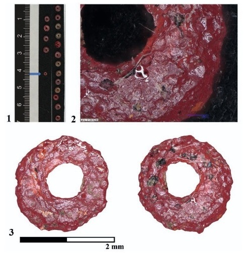 (paciorek oznaczony niebieską strzałką); 2 - zbliżenie; 3 - widok dwóch stron. Fot. R. Czech-Błońska, A.Kurzawska