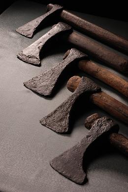 W uzbrojeniu dominują topory (159 egz.) — największy obok grotów włóczni oraz mieczy zbiór odnotowany wśród wczesnych grodów piastowskich; w tej grupie militariów zwracają uwagę egzemplarze o bardzo wyraźnych nawiązaniach północnych (topory zbliżone do typów B, G, H, M i E), obok których znamy (importowane?) czekany, czy związany z obszarem bałtyjskim topór typu Laptau; część toporów stanowić mogła wyposażenie wspomnianej drużyny wojowników skandynawskich.