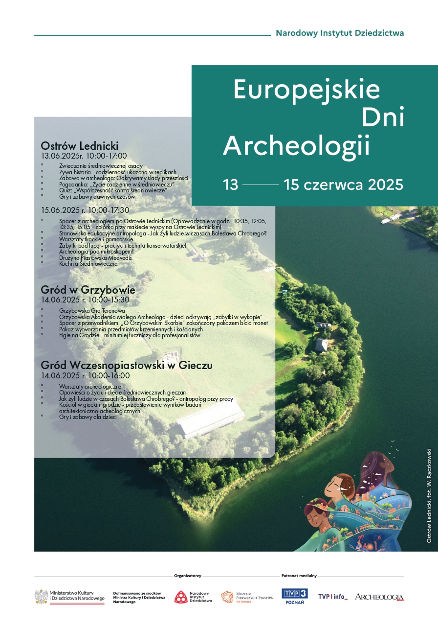W dniach 13–15 czerwca Muzeum Pierwszych Piastów na Lednicy – opiekun unikatowych grodzisk w Ostrowie Lednickim, Gieczu i Grzybowie – zaprasza do wspólnego odkrywania tajemnic przeszłości. W ramach międzynarodowego święta archeologii przygotowaliśmy bogaty program wydarzeń, warsztatów i spotkań, które pozwolą uczestnikom zanurzyć się w codzienność wczesnośredniowiecznych społeczności, poznać realia życia w czasach pierwszych Piastów oraz z bliska przyjrzeć się pracy archeologa i antropologa.