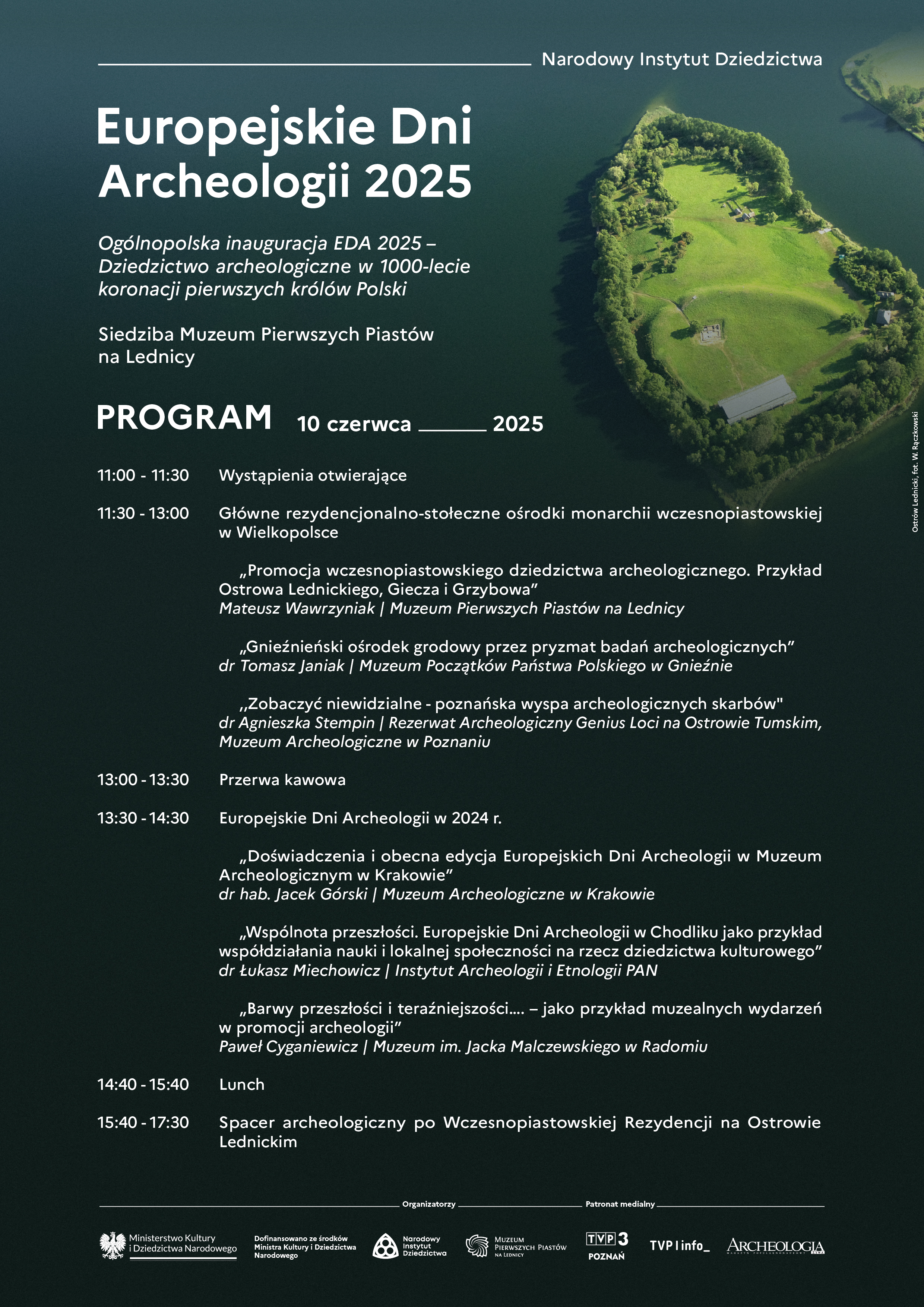 Zaprezentujemy Wam Ostrów Lednicki, Giecz, Gniezno i Poznań. W drugim panelu głos oddamy przedstawicielom instytucji, które w zeszłym roku włączyły się w organizację EDA, proponując publiczności wyróżniające się w skali kraju wydarzenia. Liczymy, że inauguracja będzie okazją do promocji Europejskich Dni Archeologii, do zaprezentowania problematyki związanej z siedzibami pierwszych Piastów oraz z zachowaniem i ekspozycją reliktów archeologicznych in situ. Będzie to też szansa na zwiedzenie jednego z naszych najważniejszych archeologicznych zabytków, jakim jest Wczesnopiastowska Rezydencja na Ostrowie Lednickim.