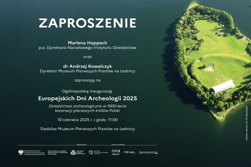 Marlena Happach - p.o. Dyrektora Narodowego Instytutu Dziedzictwa oraz dr Andrzej Kowalczyk - Dyrektor Muzeum Pierwszych Piastów na Lednicy zapraszają na Ogólnopolską inaugurację Europejskich Dni Archeologii 2025 "Dziedzictwo archeologiczne w 1000-lecie koronacji pierwszych królów Polski". Uroczysta inauguracja będzie miała miejsce 10 czerwca 2025 r. o godz. 11.00 w Siedzibie Muzeum Pierwszych Piastów na Lednicy. Sprawdź program wydarzenia i zarejestruj się za pośrednictwem formularza.