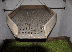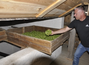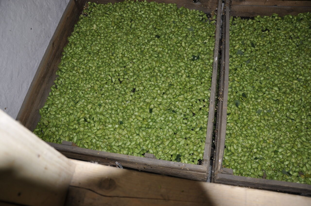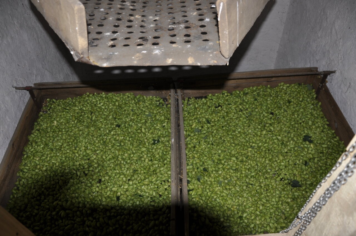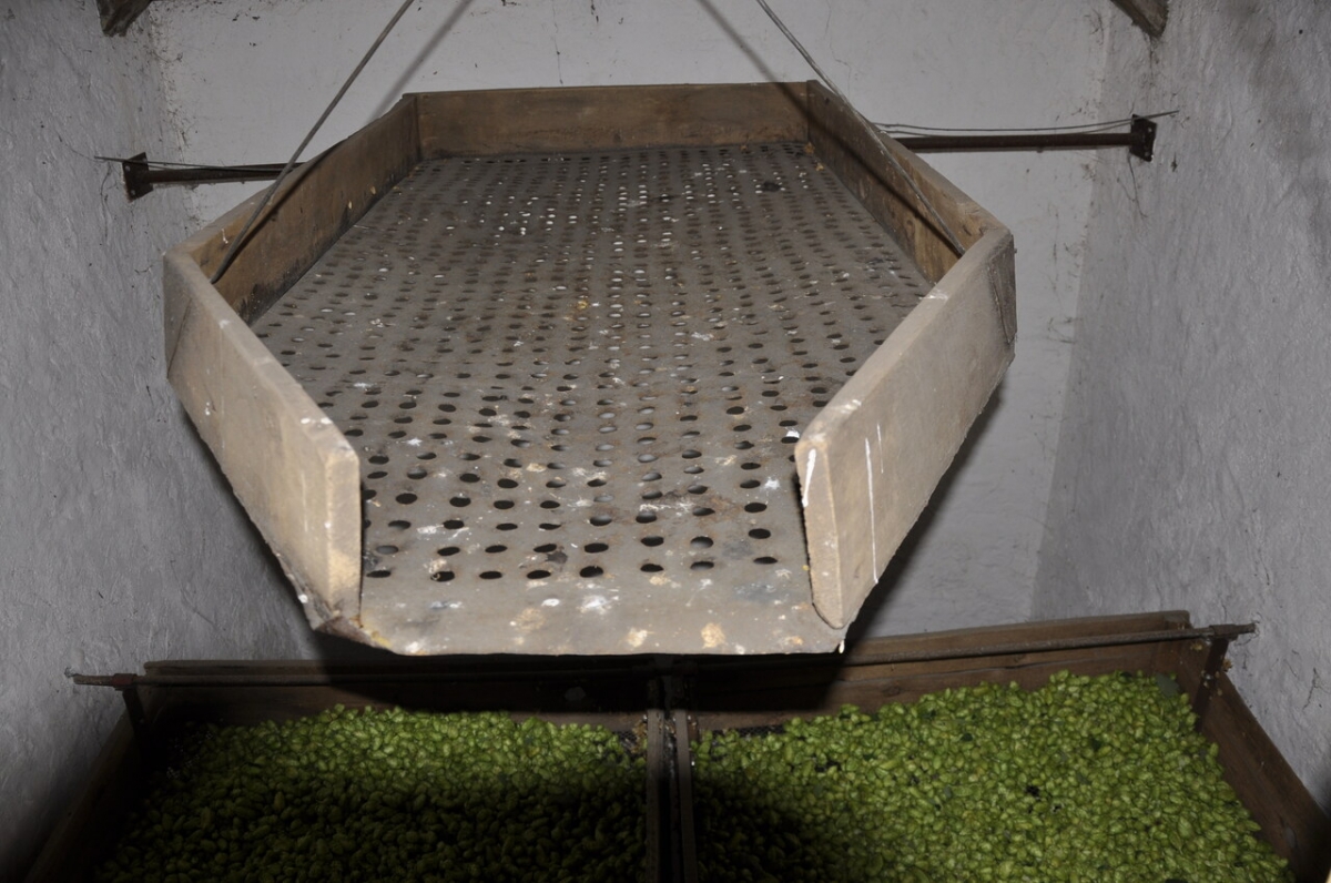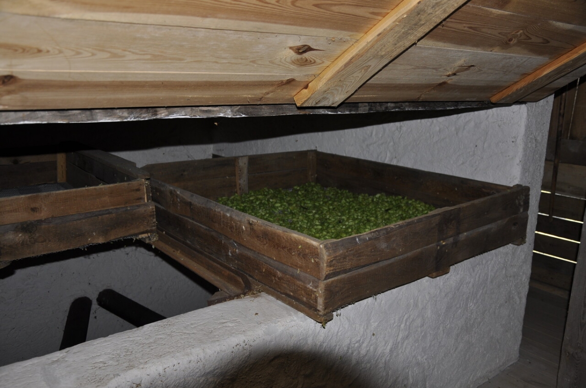 W Wielkopolskim Parku Etnograficznym stosuje się suszenie ogniowe w temperaturze 38-40°C. Świeżo zebrany chmiel rozsypuje się na górnej kondygnacji sit i rozprowadza równomiernie grabiami w warstwę grubości 10-20 cm. Odpowiednio wysuszone szyszki trafiają następnie do tzw. wańtuchów.