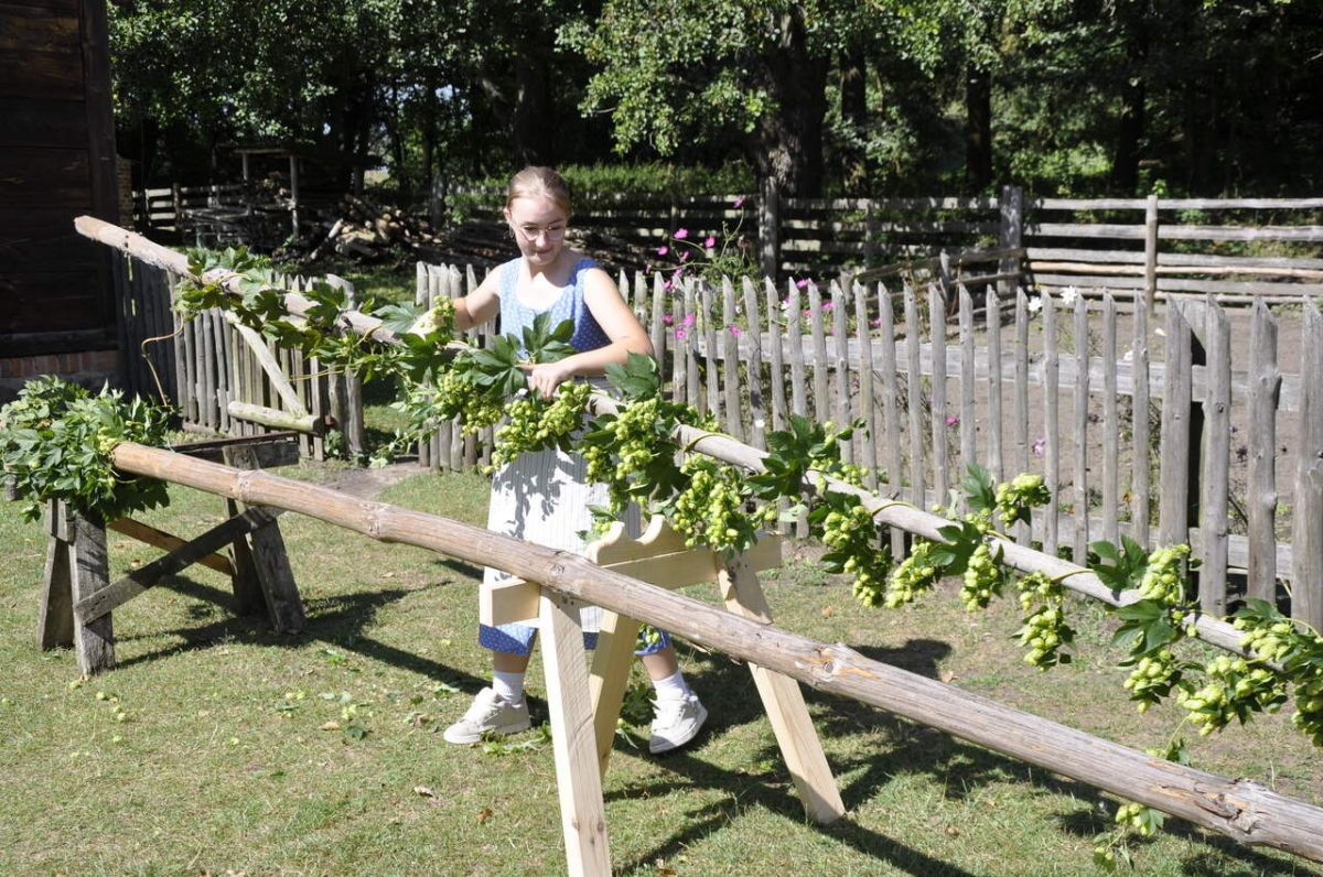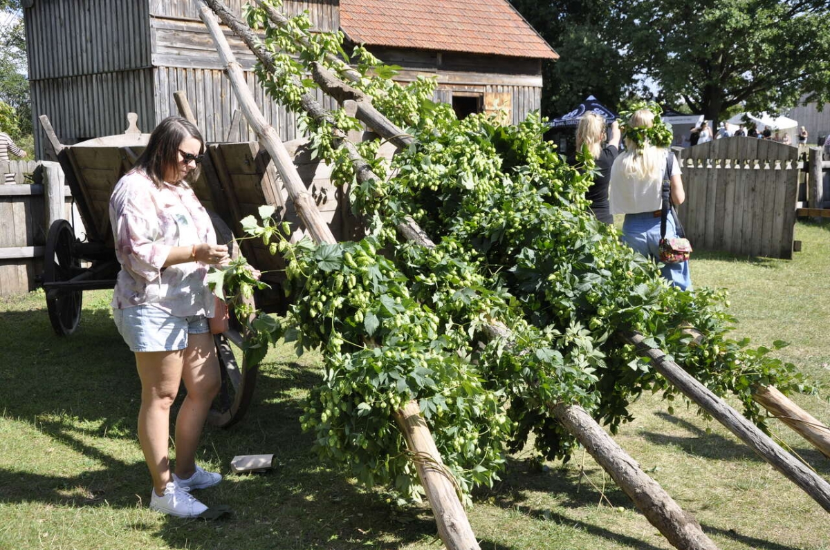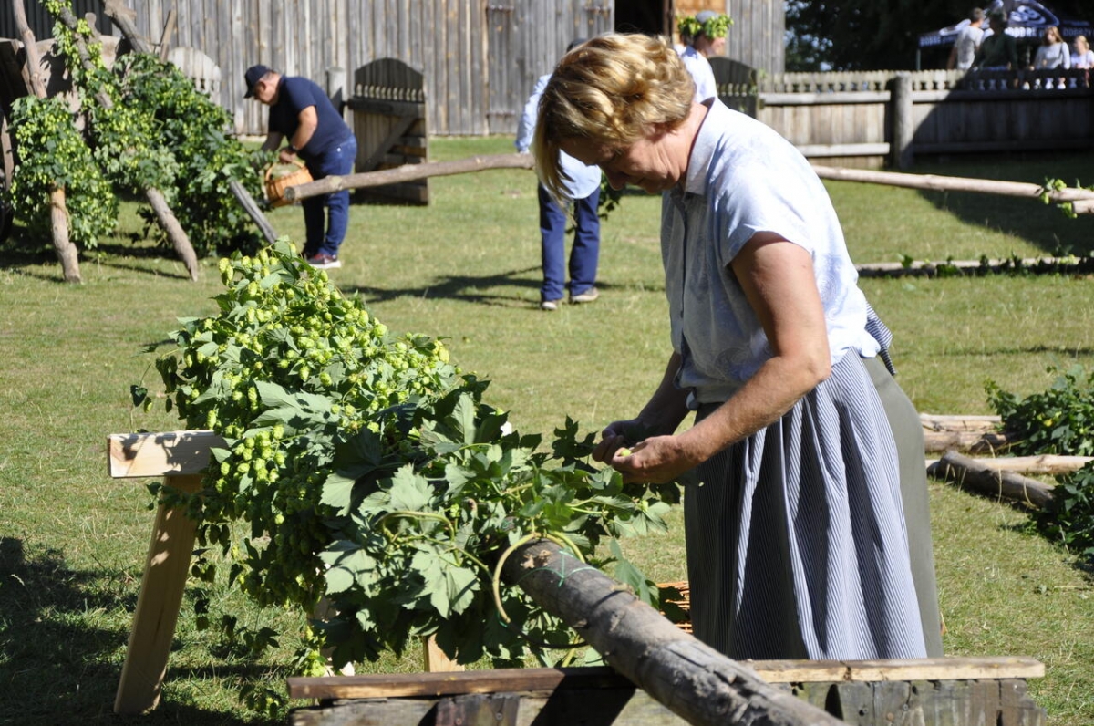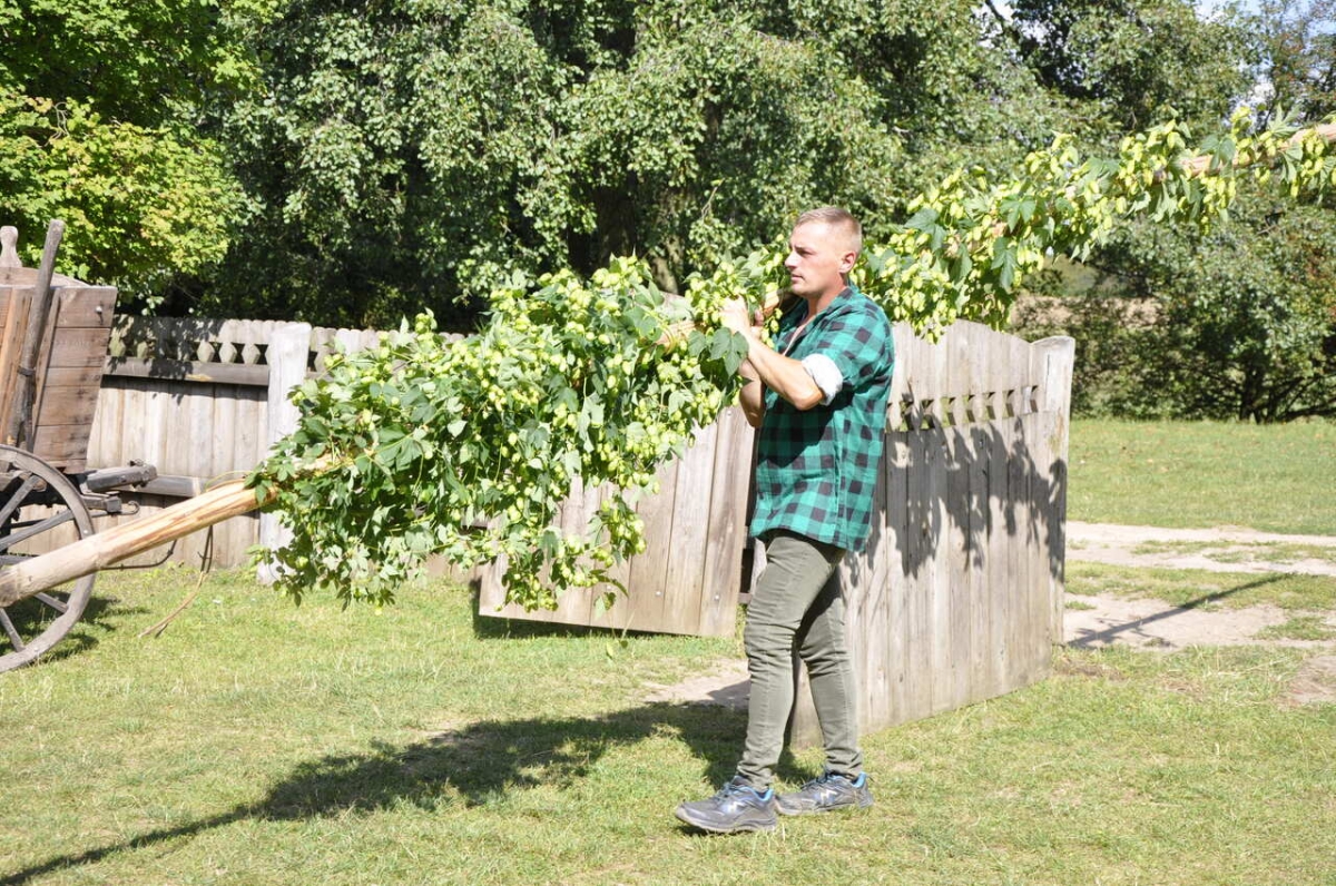 Najważniejszym punktem dnia były oczywiście żniwa. Obrywanie szyszek odbywało się w zagrodzie olęderskiej z nowotomyskiego, gdzie zaprezentowano tradycyjne metody zbioru chmielu. Surowiec zrywany był ręcznie, sortowany według wielkości i przygotowywany do suszenia.