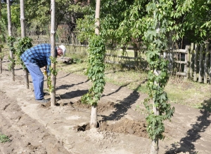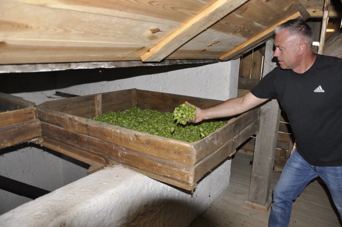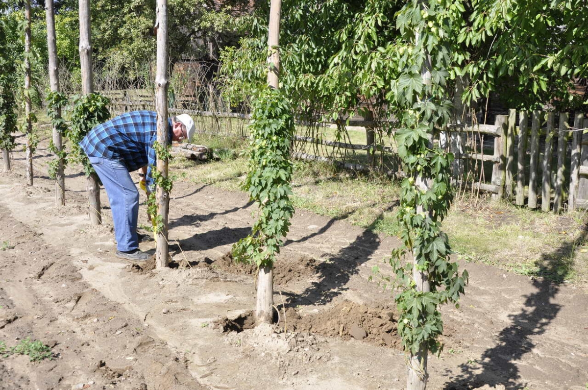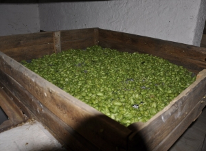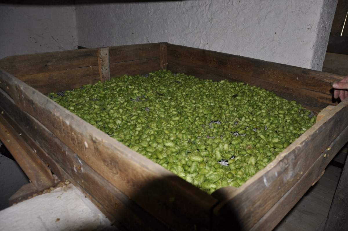 Jak czytamy na tablicy informacyjnej w suszarni chmielu z Chojnik (I poł. XX wieku), przystępując do zbioru chmielu należy na wysokości 100-150 cm odciąć łodygi, a następnie przy pomocy specjalnej dźwigni wydobyć z ziemi tykę chmielową. Zebrane z łodyg szyszki trafiają na sita do suszarni.