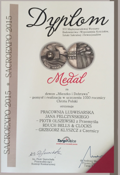 Dzwon ,,Mieszko i Dobrawa" opuścił już pracownię ludwisarską. Można było go podziwiać podczas targów SACROEXPO w Kielcach. Za pomysł i realizację w uczczeniu 1050. rocznicy chrztu Polski dzwon ,,Mieszko i Dobrawa" został uhonorowany medalem Sacroexpo 2015.
