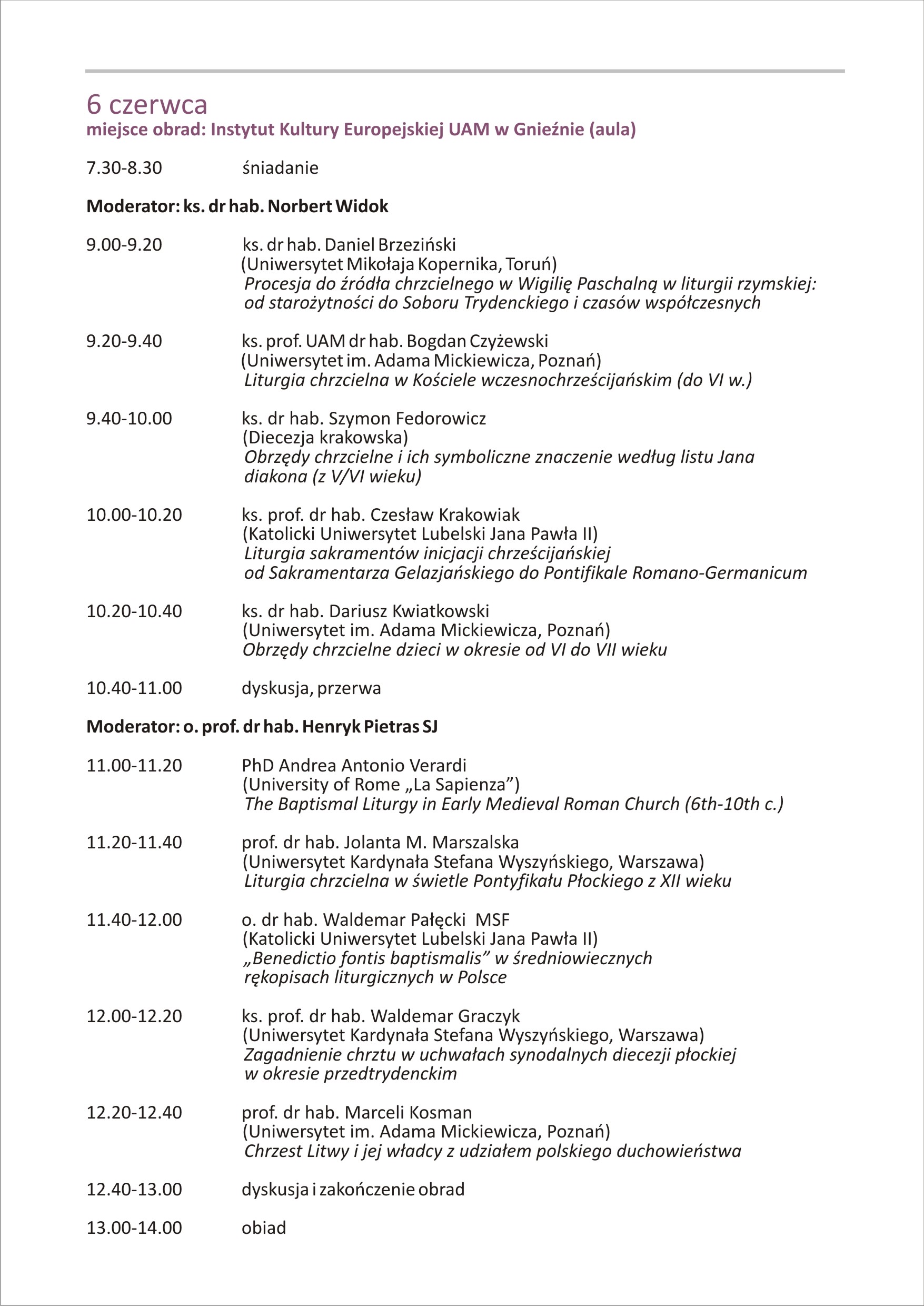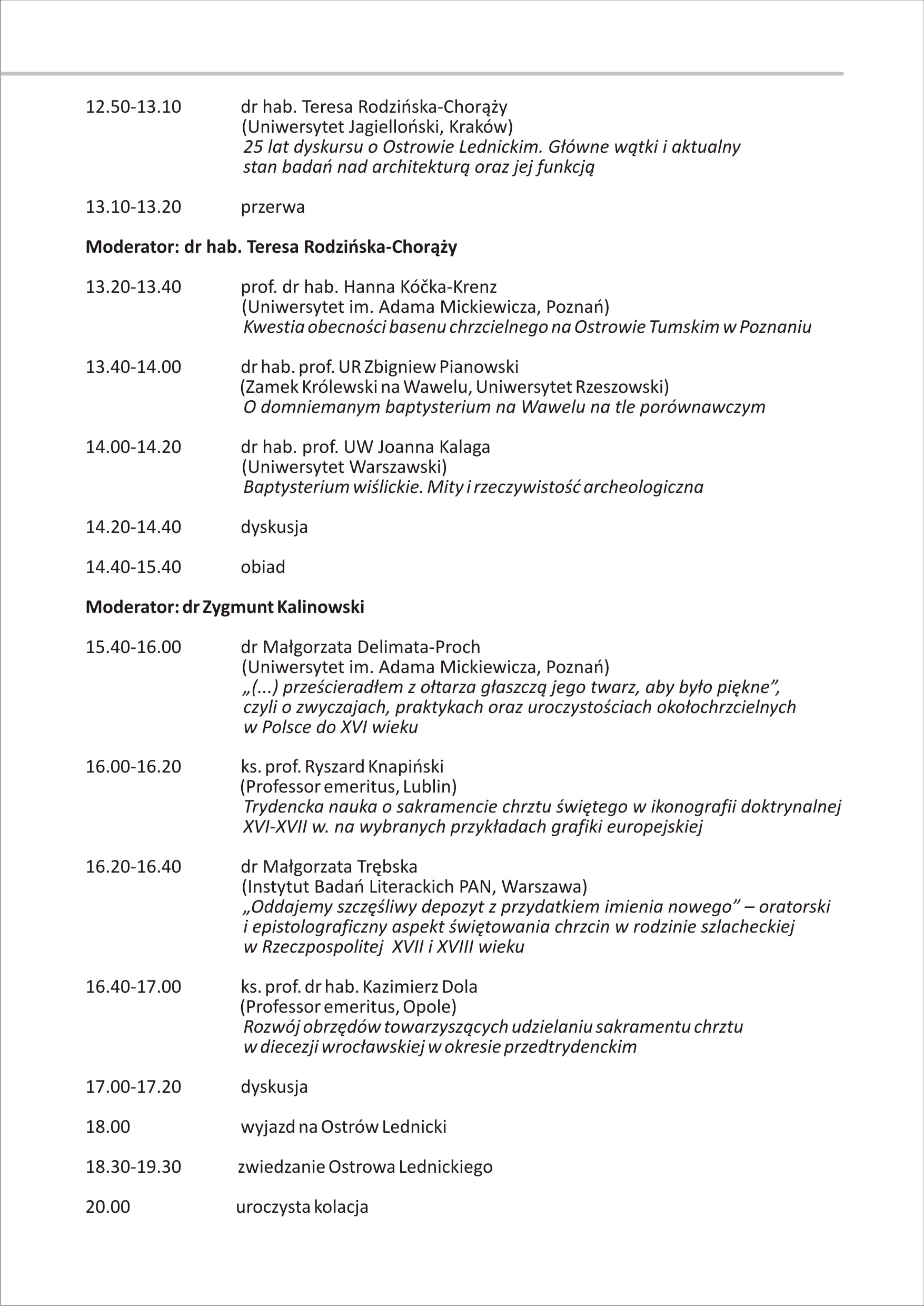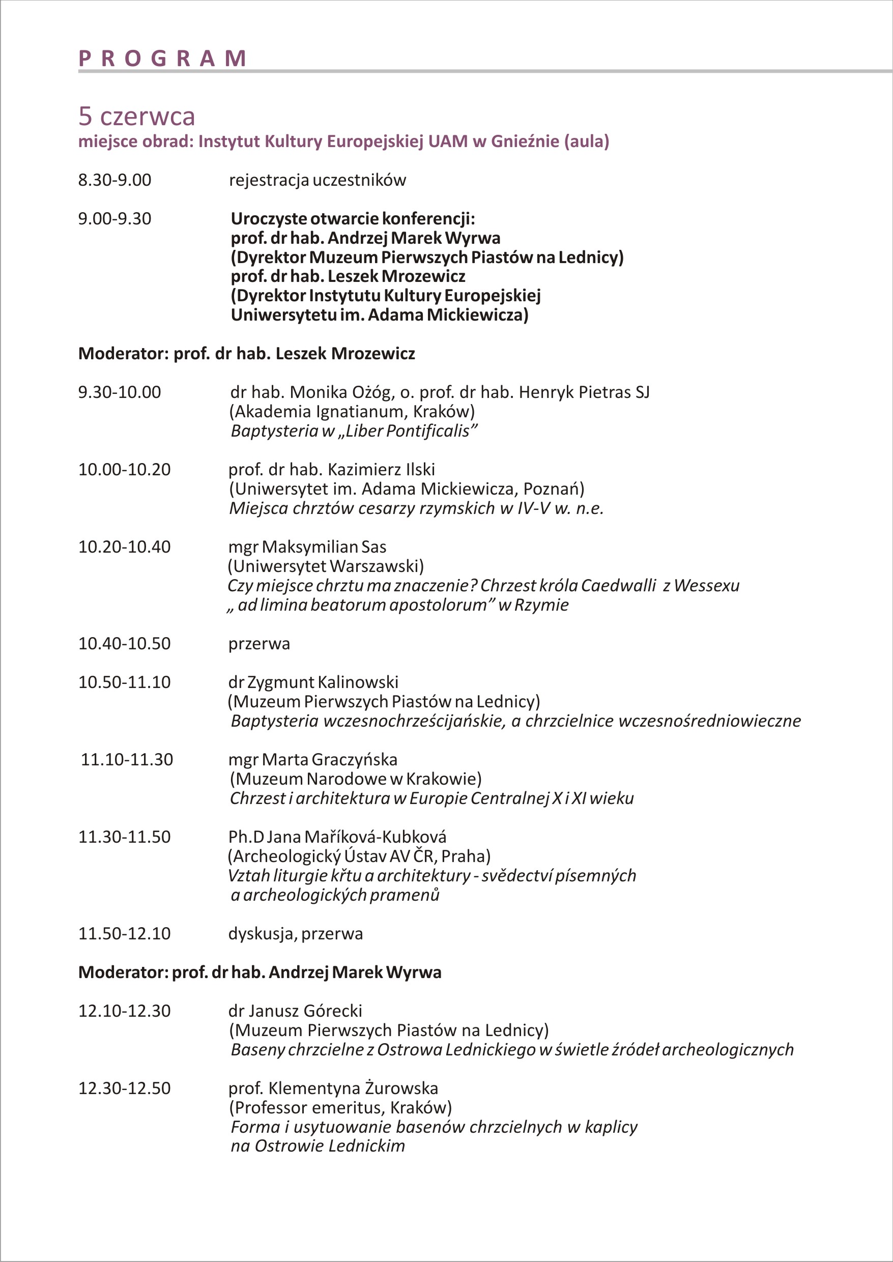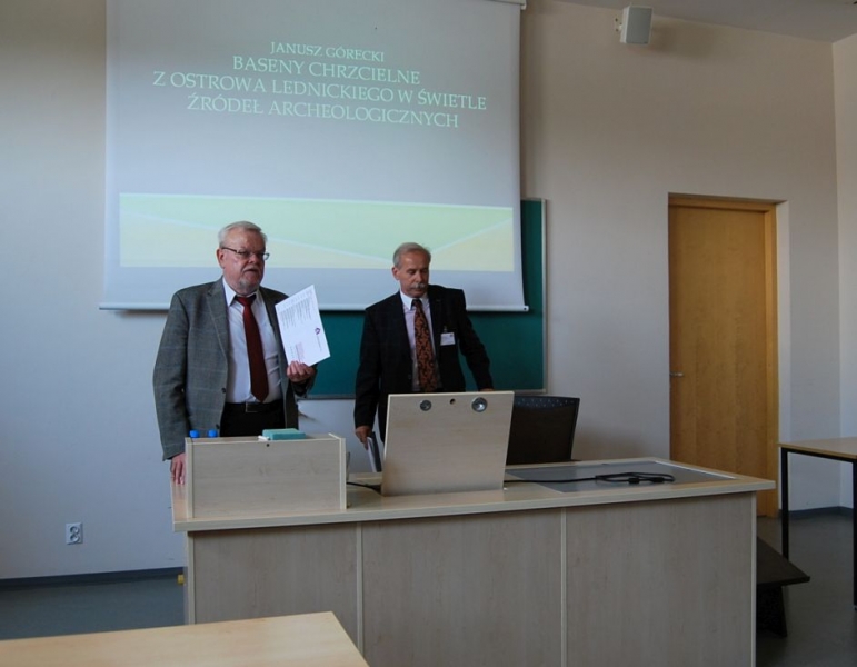 Obrady konferencyjne odbyły się w Kolegium Europejskim w Gnieźnie. Przedstawiona została tytułowa problematyka w szerokich ramach terytorialnych i chronologicznych obejmujących strefę śródziemnomorską, tereny państwa bułgarskiego, Wielkich Moraw, Czech oraz Polski i Rusi. Jednym z wiodących zagadnień była kwestia najstarszych urządzeń chrzcielnych ziem Polski – obiektów z Ostrowa Lednickiego, Poznania i Krakowa. Szczególną uwagę poświęciliśmy specyficznemu charakterowi basenów chrzcielnych z Ostrowa Lednickiego (stan naukowej dyskusji oraz archeologiczny kontekst obiektu).